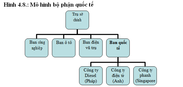 Mô hình bộ phận quốc tế (international division structure): Tập hợp nhóm các hoạt động kinh doanh quốc tế lại vào một bộ phận, một ban để những nhân sự phụ trách chuyên môn về quốc tế giải quyết những vấn đề khác nhau như hồ sơ xuất khẩu, giao dịch ngoại hối, quan hệ với chính phủ nước ngoài … (Xem Hình 4.8.). Mô hình này có khả năng thích nghi nhanh với những thay đổi của môi trường, cho phép doanh nghiệp hoạt động trên nhiều thị trường khác nhau. Mô hình này cũng hạn chế những lãng phí lặp đi lặp lại trong các hoạt động ở nhiều nơi trong tổ chức.