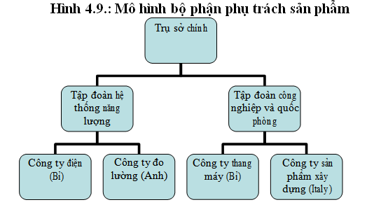 Mô hình bộ phận phụ trách sản phẩm (product division structure): Mô hình phụ trách sản phẩm là một trong những mô hình phổ biến nhất tại các doanh nghiệp kinh doanh quốc tế hiện nay do hầu hết các doanh nghiệp này đều có dải hàng hóa đa dạng và khác biệt (Xem Hình 4.9). Ví dụ, việc sáp nhập giữa công ty Moet Hennessy và Louis Vuitton đã tạo ra tập đoàn hàng hóa sang trọng lớn nhất thế giới, tập đoàn LVMH, trong đó những hãng nước hoa Christian Dior, đồng hồ Tag Heuer, đồ túi xách Louis Vuitton, rượu sâm panh Moet & Chandon là thuộc trong các thương hiệu hàng hóa của tập đoàn. Việc không có sự tương đồng giữa nhiều dòng sản phẩm đã dẫn tới việc tập đoàn LVMH chia nhỏ thành 5 bộ phận, mỗi bộ phận tập trung vào một phân đoạn thị trường riêng biệt trên quy mô toàn cầu, đó là: rượu và đồ uống có cồn, thời trang và đồ da thuộc, nước hoa và mỹ phẩm, đồng hồ và trang sức, và hàng bán lẻ khác. Mặc dù có sự lắp lẫn, trùng lặp ở các thị trường cụ thể, các kênh phân phối, các chuỗi cung ứng nhưng các bộ phận này đều tương đối độc lập.