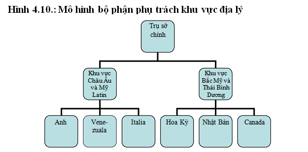 Mô hình bộ phận phụ trách khu vực địa lý (geographic area division structure): Các doanh nghiệp thường sử dụng mô hình phụ trách theo khu vực địa lý (Xem Hình 4.10) để vận hành tổ chức của mình khi các doanh nghiệp có hoạt động vận hành ở nước ngoài với quy mô lớn mà tập trung vào một nước hay một vùng cụ thể, bao gồm cả nước chủ nhà. Mô hình này cũng phổ biến đối với các công ty đa quốc gia của Châu Âu do các công ty này thường không có một thị trường nội địa có quy mô lớn. Mô hình này thường phù hợp trong trường hợp doanh nghiệp có được lợi ích từ quy mô sản xuất trên phạm vi khu vực, không phải trên phạm vi toàn cầu do quy mô thị trường hoặc công nghệ sản xuất đặc thù của ngành. Thông thường, mô hình này được các doanh nghiệp theo đuổi chiến lược đa quốc gia sử dụng do mô hình này dành quyền quản lý phân cấp cho các công ty ở từng nước điều chỉnh thích nghi hơn với các điều kiện của thị trường địa phương.