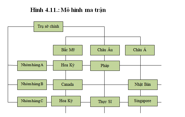Mô hình ma trận (matrix structure): Các doanh nghiệp kinh doanh quốc tế theo đuổi chiến lược xuyên quốc gia tại đó đáp ứng cả hai yêu cầu đó là hội nhập, toàn cầu hóa và thích nghi địa phương. Để thực hiện chiến lược này, các doanh nghiệp thường thiết kế tổ chức của mình theo mô hình ma trận để cho phép tận dụng được ưu điểm của mô hình theo chức năng và mô hình theo bộ phận (Xem Hình 4.11). Mô hình ma trận về mặt lý thuyết cho phép một doanh nghiệp kinh doanh quốc tế còn hạn chế được những nhược điểm của hai mô hình kể trên.